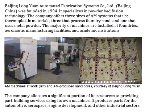 在最新发布的《Wohlers Report2015》的亚洲公司部分中,提及了包括北京隆源成型在内的国内多家研发、销售工业级3D打印的代表性企业