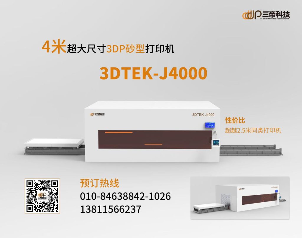 為滿足大型鑄件制造的市場需求,3D打印裝備及快速制造服務(wù)提供商北京三帝科技股份有限公司于國內(nèi)率先推出了自主研發(fā)的超大尺寸3DP砂型打印機(jī)3DTEK-J4000,該設(shè)備突破傳統(tǒng)加工尺寸限制,最大可成型4米的砂型。設(shè)備創(chuàng)造性地采用了無砂箱柔性區(qū)域成型技術(shù),破除了設(shè)備成型尺寸越大、設(shè)備價(jià)格狂飆的怪象,使得4米的或更大尺寸的設(shè)備,與2.5米的設(shè)備價(jià)格相差無幾成為可能。經(jīng)濟(jì)、靈活,以更低的單位成本和更短的交付時(shí)間,經(jīng)濟(jì)高效地實(shí)現(xiàn)超大尺寸的砂型制造,并可根據(jù)用戶需求按需定制擴(kuò)展打印平臺(tái),滿足10米+級(jí)的生產(chǎn)需求(6米/8米/10米設(shè)備已在同步接受預(yù)定),幫助用戶最大限度地提高生產(chǎn)力。(國外的朋友可以點(diǎn)擊這里了解我們的 large 3D printer)