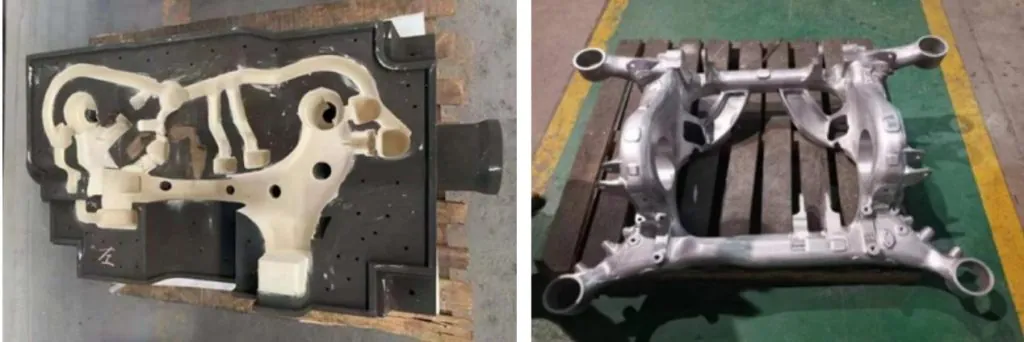 三帝科技為客戶交付的輕量化、大曲面、薄壁新能源商卡副車架,重約27KG,壁厚5.5mm,采用優(yōu)質(zhì)鋁材T6061。傳統(tǒng)鑄造方式僅模具制造就需要1-2個(gè)月,且費(fèi)用高昂。采用三帝科技3D鑄造工藝2周即完成成品交付。