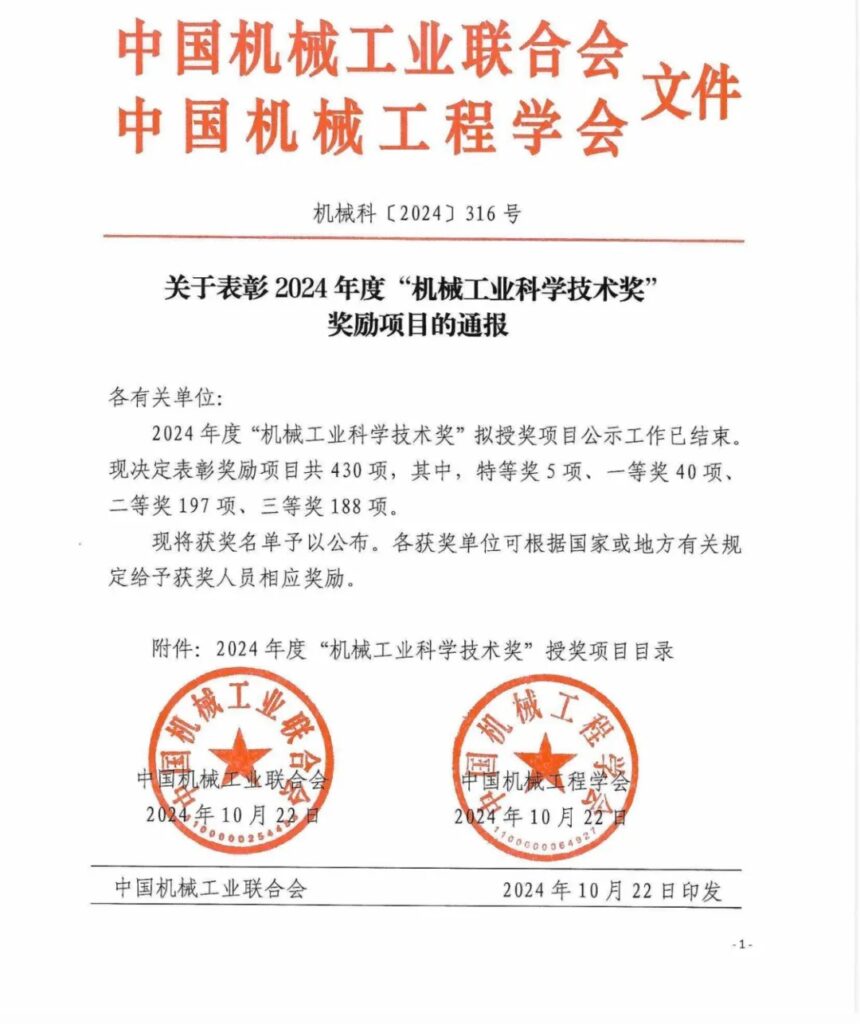 機械工業科學技術賞は、中國機械工業連合會と中國機械工程學會が共同で設立し、中華人民共和國科學技術部の認可を受けた、國家機械工業における総合的な科學技術賞である。2024年、総計430のプロジェクトが「機械工業科學技術賞」を受賞し、そのうち、5つのプロジェクトが大賞、40のプロジェクトが一等賞、197のプロジェクトが二等賞、188のプロジェクトが三等賞を受賞した。この賞は會社の科學技術革新能力を全面的に肯定し、評価するものである。