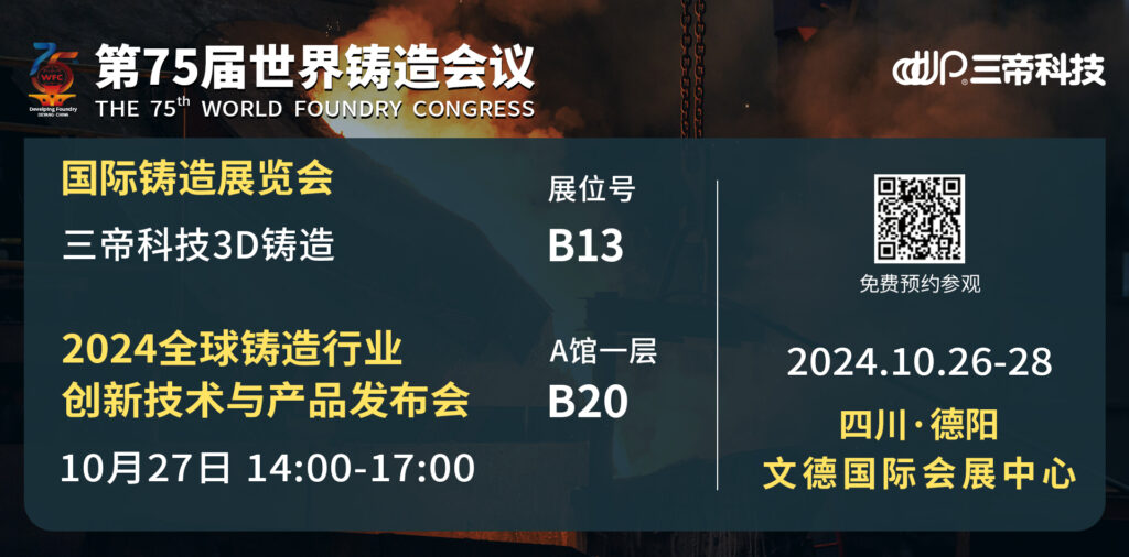 更多詳情,敬請關注10月26-28日將在四川省德陽市隆重舉辦的鑄造業盛會“第75屆世界鑄造會議”,三帝科技將攜3D鑄造解決方案(展位號:B13)登陸展會,并在27日的“2024全球鑄造行業創新技術與產品發布會”中做精彩分享。