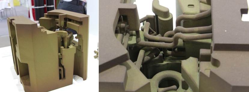 SLS砂鑄工藝,砂芯強度達4-6Mpa,精度0.1-0.2mm,適用于復(fù)雜管路、油路類產(chǎn)品。