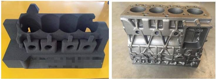 Xinxin литья через Longyuan формовки 3DP песчаный принтер с использованием песка быстрого литья процесс для автомобильного завода пробного производства блока двигателя, из-за сложности структуры цилиндра, и толщина стенки мала, если традиционный метод производственного цикла занимает более 1 месяца. 3DP песчаная печать оборудование, произведенное песком, точность и прочность, чем традиционный процесс были значительно улучшены, прочность на растяжение до 2MPa, шероховатость поверхности литья ниже Ra12.5, дефекты хорошо контролируются, нет суккулента, пористости, трещин, шлака, нет дефектов поверхности и дефектов. Поставка готовых отливок из серого чугуна (HT250) заняла всего 10 дней, производственный цикл сократился на 2/3, а стоимость снизилась на 30%.