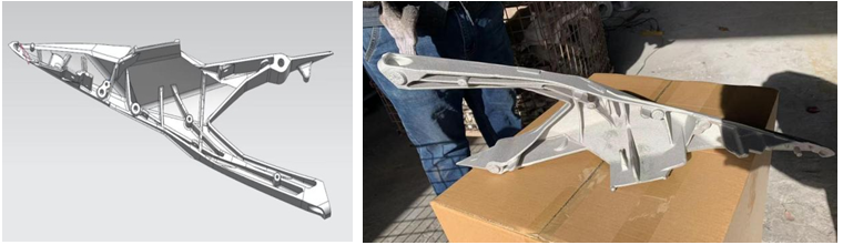 Компания Xinxin Casting использует процесс быстрого литья в песчаные формы с помощью 3DP песчаного принтера Longyuan Forming для пробного производства легких автомобильных рам для предприятия по производству новых энергетических транспортных средств, при этом производственный цикл занял бы 40 дней, если бы он производился традиционными методами. Благодаря использованию 3DP песчаного принтера быстрого литья, точность размеров конечной отливки достигает уровня CT7, шероховатость поверхности ниже Ra12.5μm, на поверхности отливки нет воздушных отверстий и трещин, форма полная и структура четкая. Готовые отливки из алюминиевого сплава (ZL101) были поставлены за 6 дней, что позволило сократить производственный цикл на 85% и снизить себестоимость на 32%.