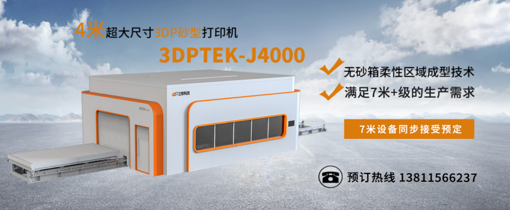 國(guó)產(chǎn)最新的大尺寸砂型 3D 機(jī) 3DPTEK-J4000 的出現(xiàn),是我國(guó)制造業(yè)不斷創(chuàng)新發(fā)展的成果。它以其先進(jìn)的技術(shù)、優(yōu)越的性能、廣泛的應(yīng)用領(lǐng)域和完善的售后服務(wù),為鑄造業(yè)帶來(lái)了全新的發(fā)展機(jī)遇。這里有一篇文章詳細(xì)論述為什么要購(gòu)買(mǎi)砂型3D打印機(jī)。